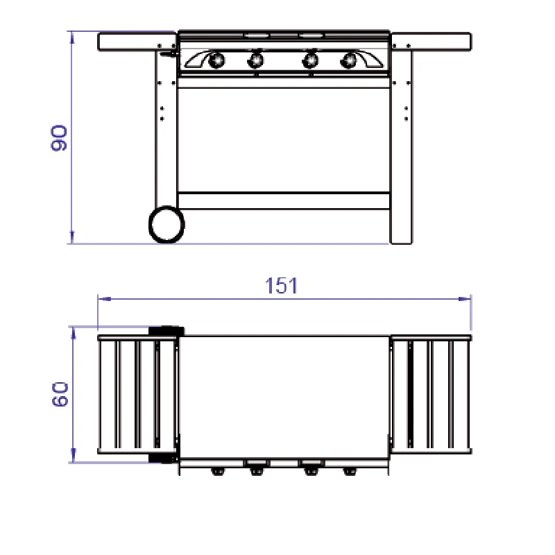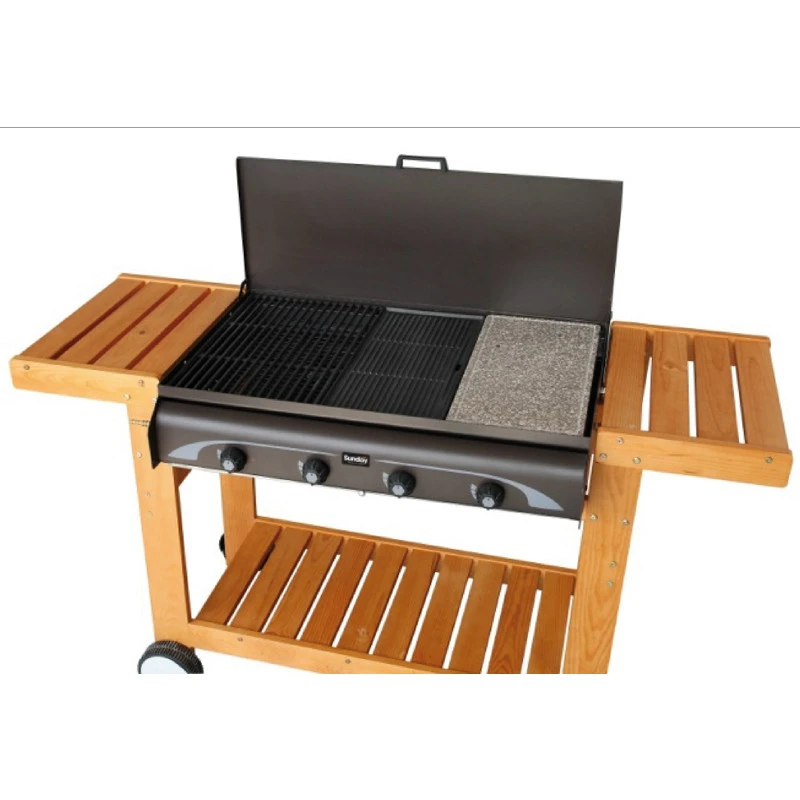 Barbacoa a gas Grill modelo Master 4, con una superficie de cocción de 81,5 x 48,5 cm y unas dimensiones de 151 x 60 x 90cm hará que sus comidas cocinadas al aire libre sean de lo más apetitosas y saludables gracias a sus 16 Kw de potencia calorífica. Tiene la función de encendido piezo-eléctrico combinada con piedra de lava y una plancha de fundición. El modelo es de madera con 2 alas laterales y una bandeja inferior para poder colocar todos sus utensilios de cocina. También lleva dos ruedas laterales para desplazar la barbacoa.