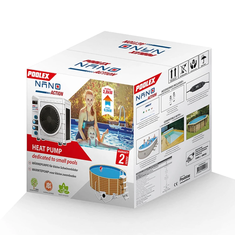 Desarrollado como una bomba de calor avanzada, ofrece todas las características de rendimiento en un tamaño ultracompacto. Gracias a su peso, se puede transportar fácilmente al final de la temporada. La Bomba de calor Poolex Nano, está fabricada para solucionar el problema de calentamiento de las piscinas elevadas; tanto de pvc, hinchable y acero. La bomba de calor Poolex Nano tiene componentes que son de grandes bombas de calor y puede lograr un COP similar a las bombas de calor de alta gama.