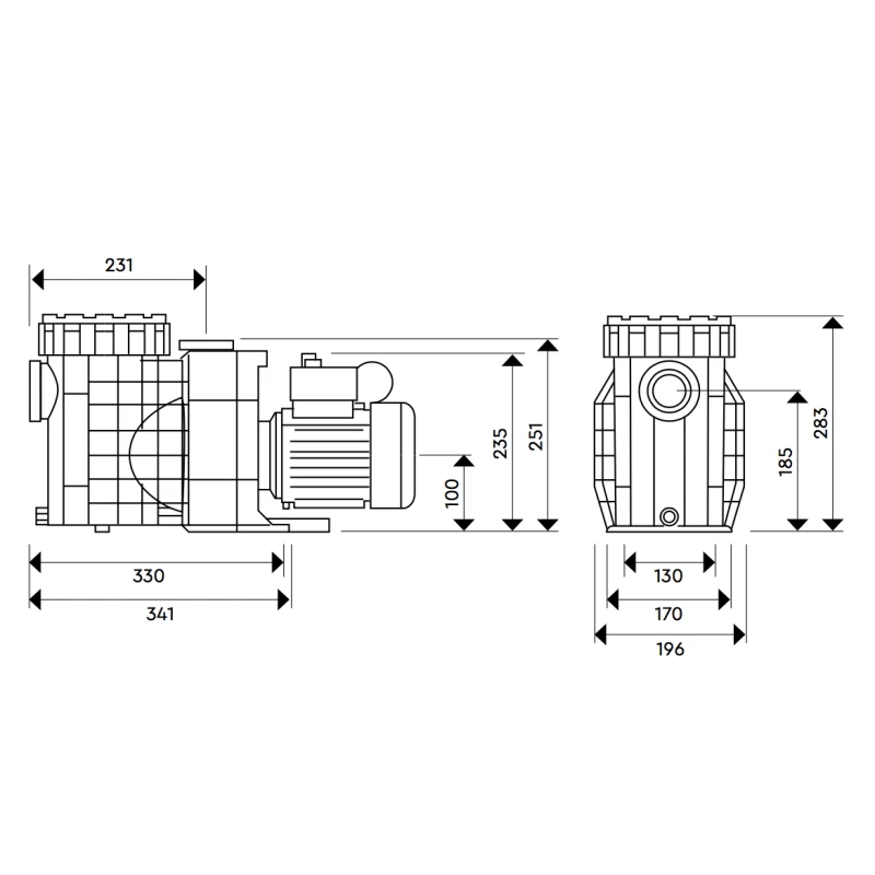 En el dibujo a continuación, podremos ver todas las medidas de la bomba de filtración. Las medidas están indicadas en milímetros mm.