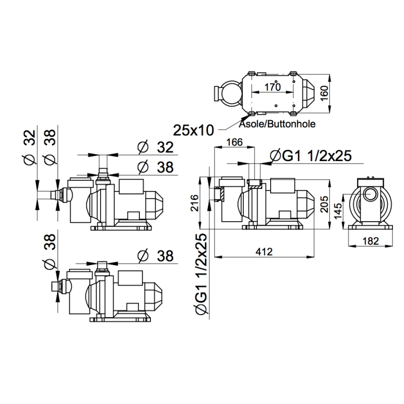 En el siguiente dibujo, podemos ver todas las medidas de la bomba de filtración. Las dimensiones están indicadas en milímetros (mm).