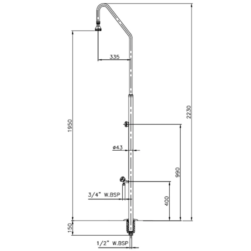 Dispone de una altura de 2 metros desde el rociador hasta el suelo, con una altura total de 224cm. El tubo central tiene un acabado brillante de acero inoxidable de gran calidad para darle una larga duración. El diámetro del tubo son 63 mm.