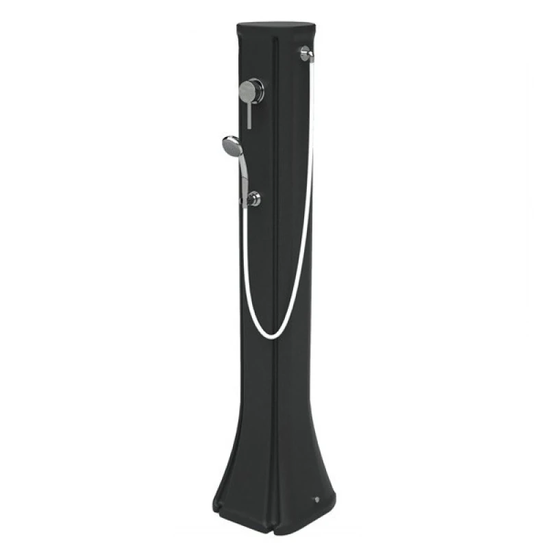 La ducha Happy Go está fabricada en polietileno HD proporcionando una garantía anticorrosión, equipada con un pomo de ducha y un grifo mezclador de temperatura, para el enfriamiento del agua. Lo presentamos en un color, antracita.