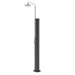 El modelo incluye un rociador antical con efecto lluvia, muy agradable al tacto y ducha lavapiés en la parte inferior con mono mando de agua fría y caliente para regular la temperatura. Está fabricado con tubo de acero inox AISI-304-L y marco de aluminio en su lateral.