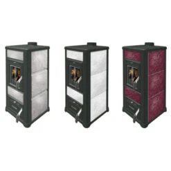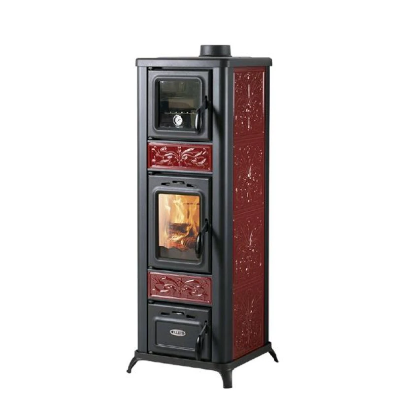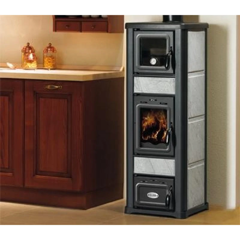 El horno que incorpora la estufa Sonia viene equipado con termómetro y rejilla para que le sea cómodo y fácil cocinar en él. Además las estufa cuenta con rejilla de sacudida, cenicero, y bonitos acabados en mayólica con relieves. La salida de humos está en la parte superior, que tiene acabados en fundición al iugal que la puerta y la cámara de combustión.