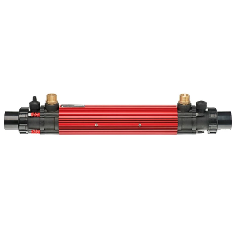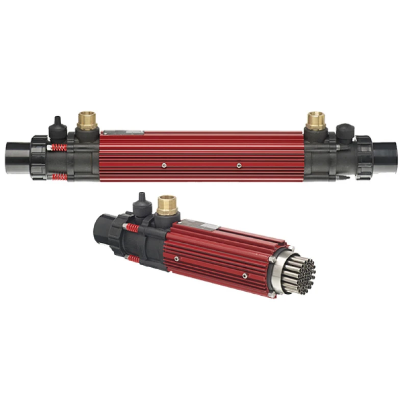 El interior del intercambiador está compuesto por números tubos de titanio compatibles con cloradores salinos y productos químicos comunes como el Cloro. Los extremos del aparato están sellados con acoples primarios y secundarios. La fabricación del G2 se ha hecho siguiendo los estándares de la alta calidad, sólo con los materiales más resistentes para darle una vida útil muy larga.