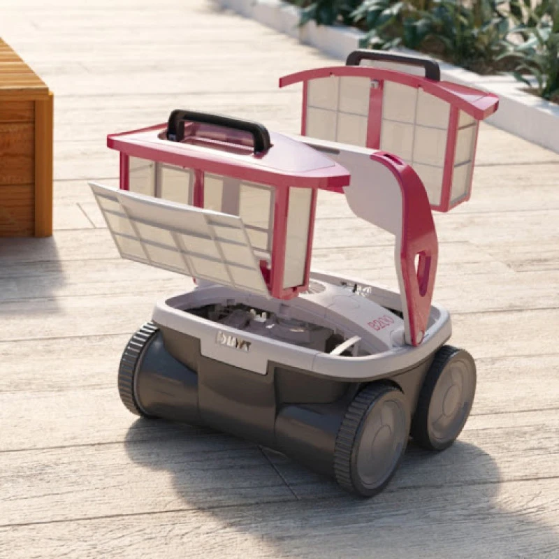 Cuenta con cuatro ruedas grandes las cuales superan cualquier tipo de obstáculo que se interponga en su camino, moviéndose fácilmente por fondo de su piscina