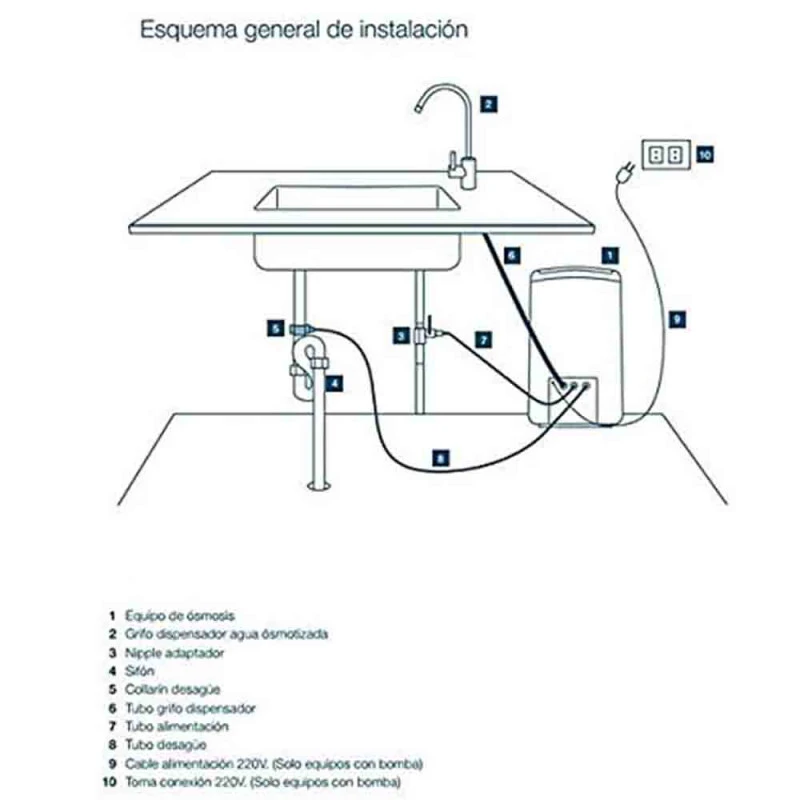 Obtenga agua en perfectas condiciones, respetando el medio ambiente y de una forma cómoda y práctica como es el equipo de osmosis. El grifo dispensador está incluido en la compra de este equipo de ósmosis, así como los tubos y accesorios para su instalación.