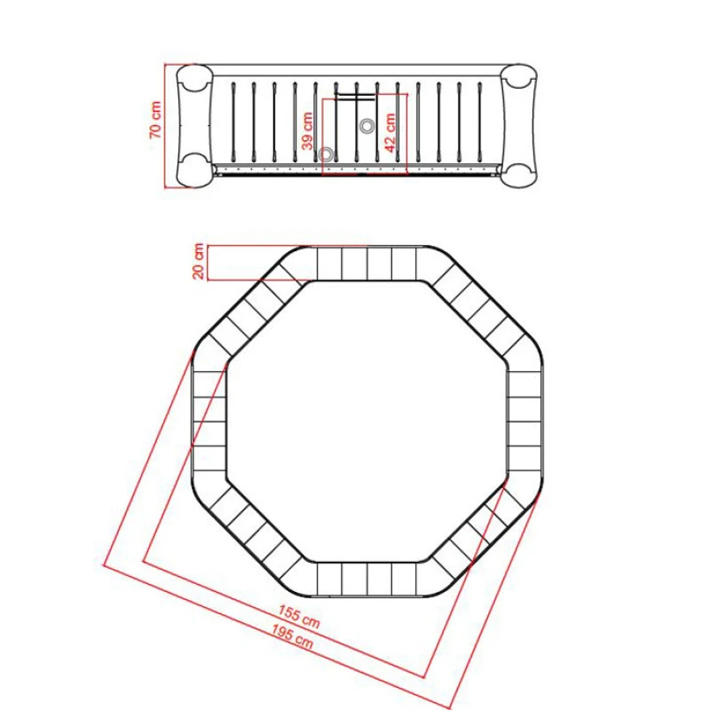 Cuenta con un diseño en forma octogonal, con capacidad para 5 o 6 personas. Además puede contar con un recalentador de agua en el bloque motor que le asegura una calefacción rápida del agua de hasta 42ºC y 2 cartuchos de filtración.