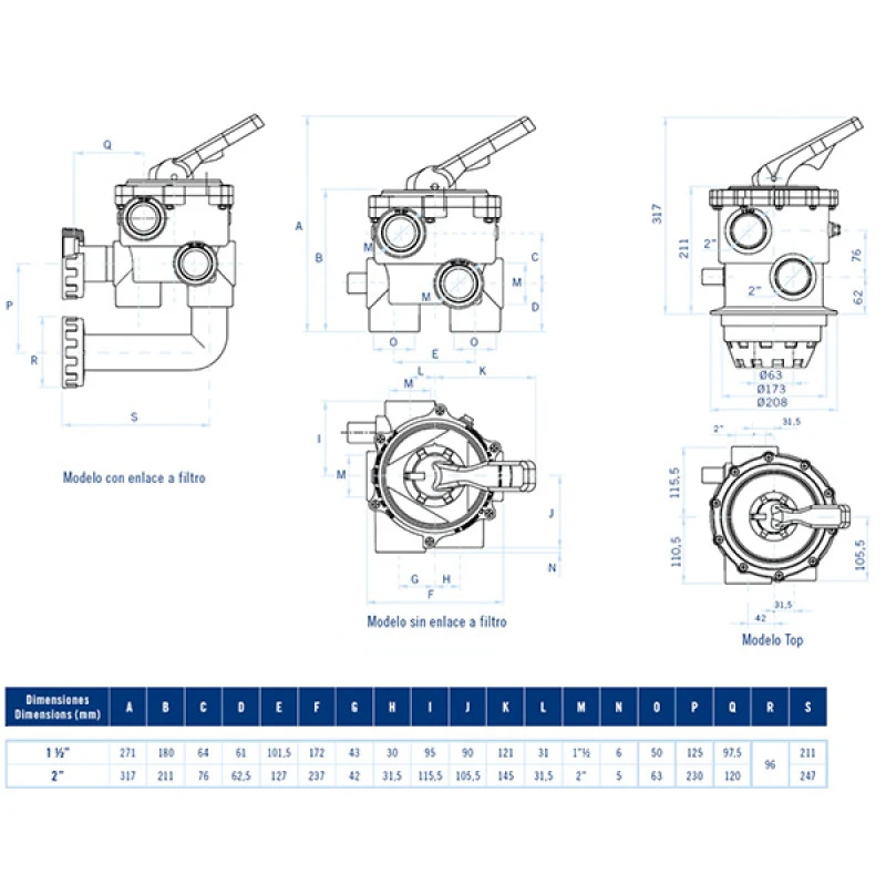 Válvula selectora de 6 vías para el sistema de filtración de arena de piscinas privadas enterradas que permite realizar todas las funciones de filtración para el mantenimiento del agua.
