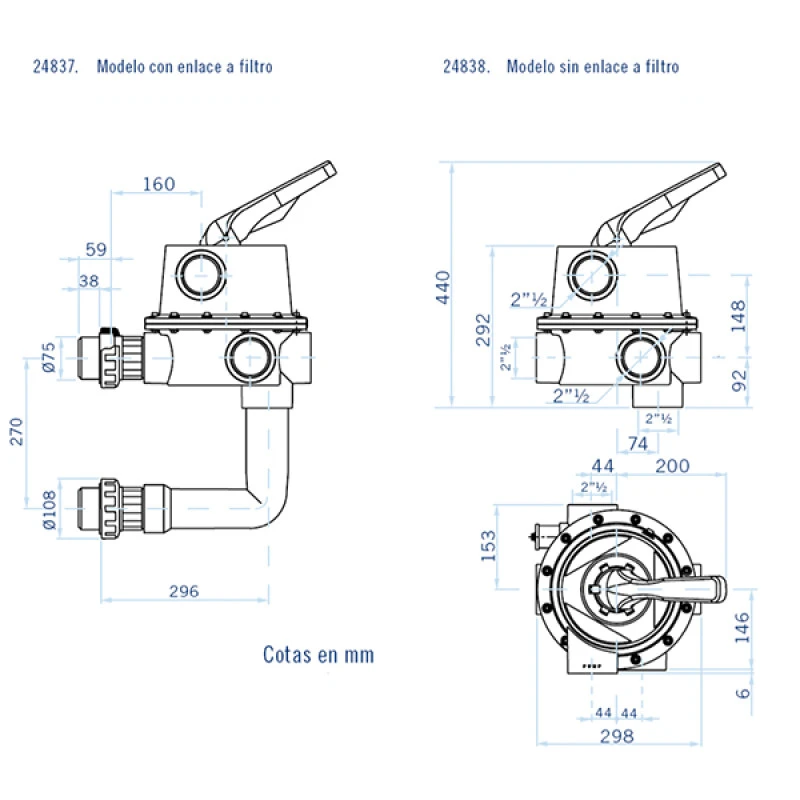 Indicada para filtros de arena con salida lateral Incluye una llave con 6 vías de trabajo con disponibles para realizar cómodamente todas las funciones de depuración del agua de piscinas y mantenimiento del filtro para obtener un agua de piscina en óptimas condiciones.