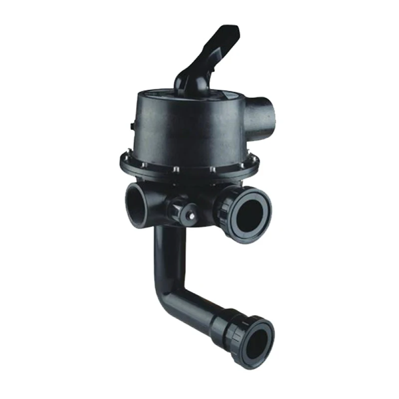 Válvula selectora de 6 vías con salida lateral y conexiones de Ø 2 ½» para filtro de arena de piscinas privadas.